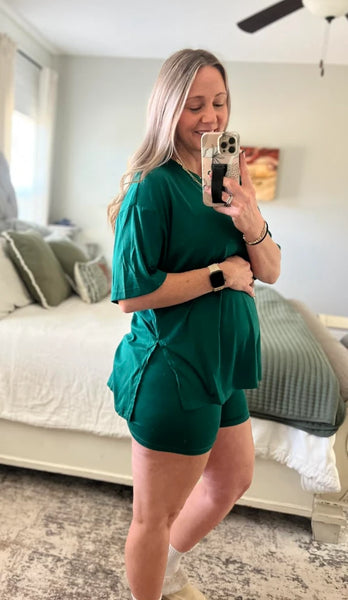 The fit is true to size for an oversized fit. I am normally a medium and was able to order the medium at 5 months pregnant and still have growing room. The quality and comfort is a 10/10, will definitely be ordering in more colors! Can be dressed up for everyday outings or down for around the house comfort.