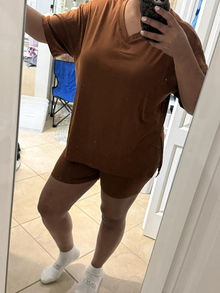 This lounge set is super lightweight, and comfortable and honestly one of my favorite casual outfits right now. The fabric feels soft, stretchy, and breathable, and the fit is exactly what I was looking for. It also runs true to the suggested sizing. I ordered the rust/brown color and it’s true to color in person. Highly recommend!