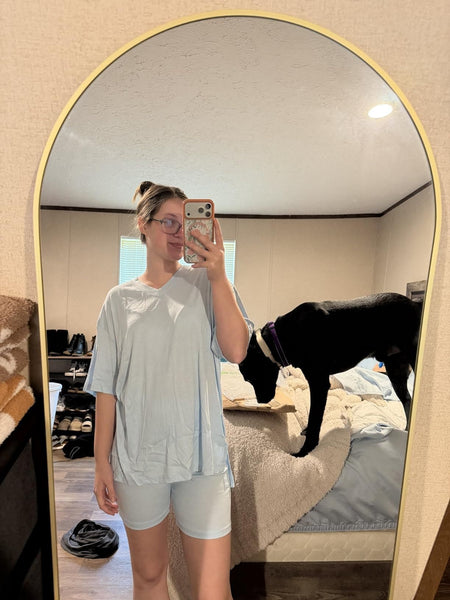 This set looks exactly as advertised. The shirt is a cute oversized top with small slits on the sides. The matching shorts are a flattering length. The shorts are not too tight but fit great. LOVE that they have a pocket even! All women's clothing needs to have pockets so that was an unexpected win. It's very comfortable, love the green color. Material is lightweight but still decent quality. For the cost I think it's a pretty great value. This will be mostly for lounging around the house but I'll definitely be wearing it out too.